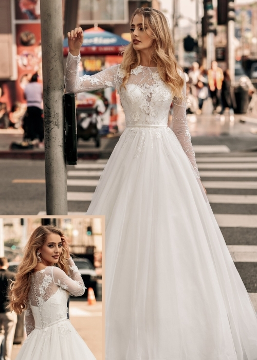 فستان زفاف أنيق بقصة الأميرات مع أكمام طويلة من الدانتيل وحزام ضيق عند الخصر.