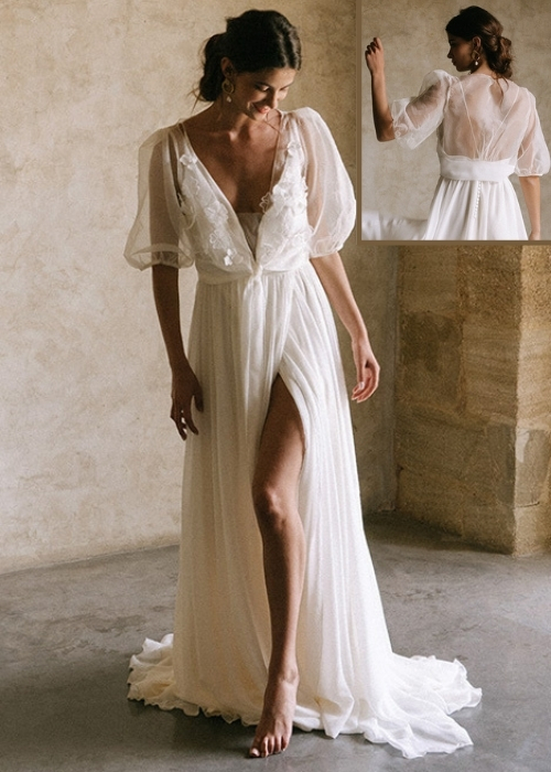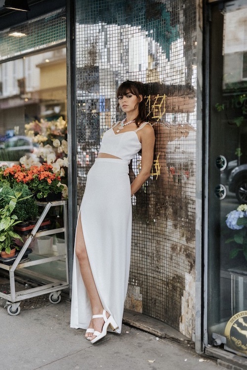 فستان زفاف مكون من قطعتين منفصلتين باللون الأبيض مع شق عند أحد الساقين.