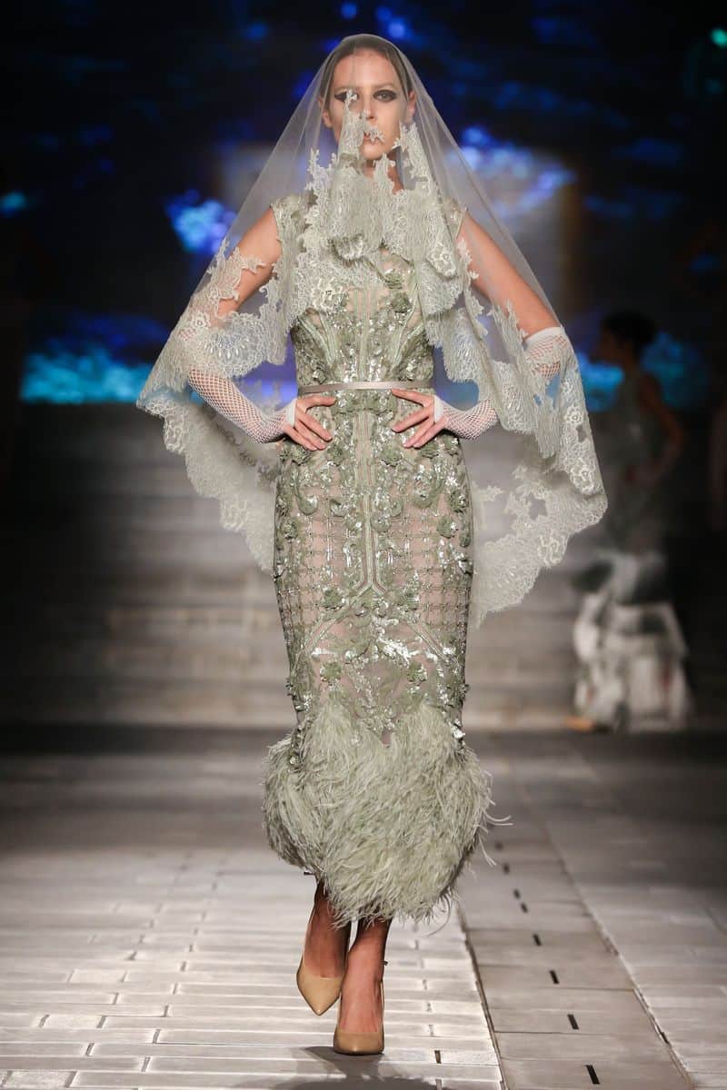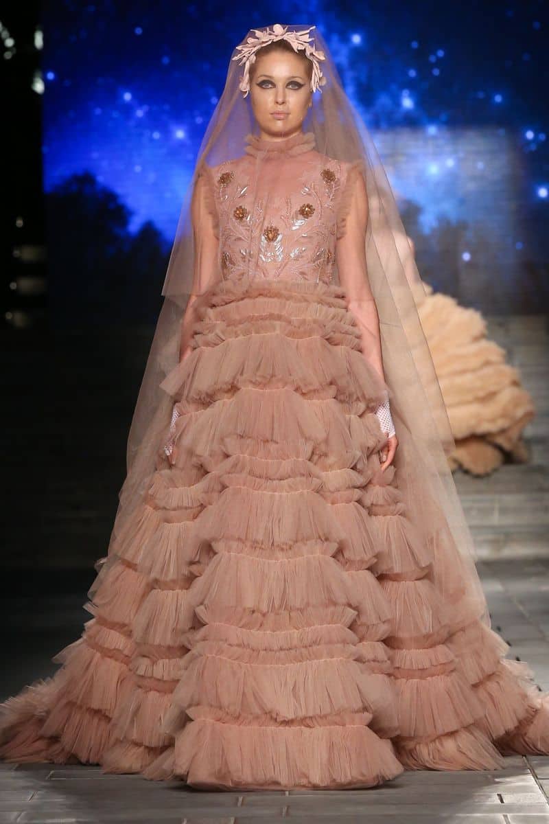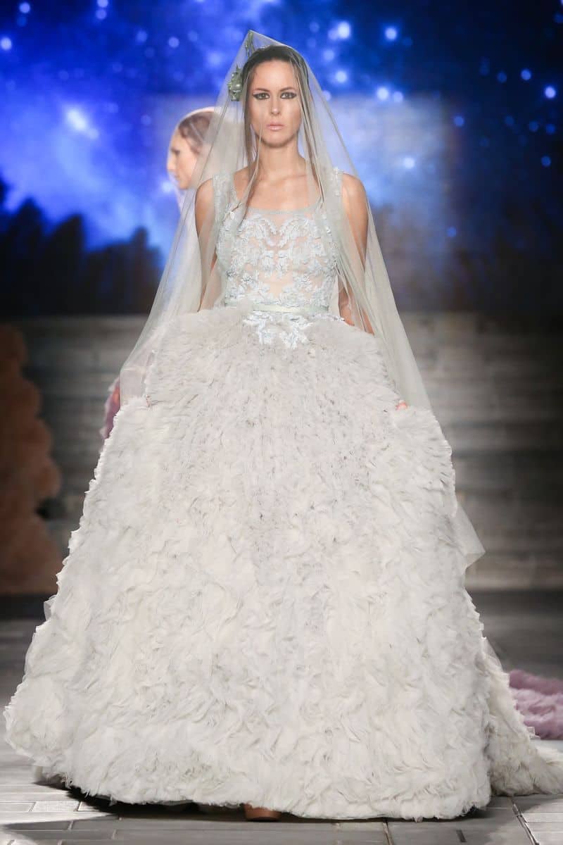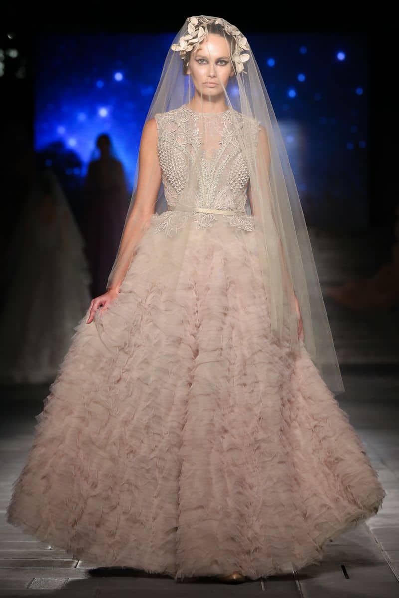 ولفتت انتباهنا الفساتين المزودة بكاب بنفس طول الفستان وأخرى مصممة بتوب Peplum . وما يميز هذا العرض خروج العارضات بفساتين أسطورية وإطلالة ملكية، حيث اعتمرن تيجان ضخمة وطرحات مطروزة غير مألوفة بألوان الباستيل الهادئ يمكنك اختيارها في حفل زفافك حتى تكوني عروس السهرة.