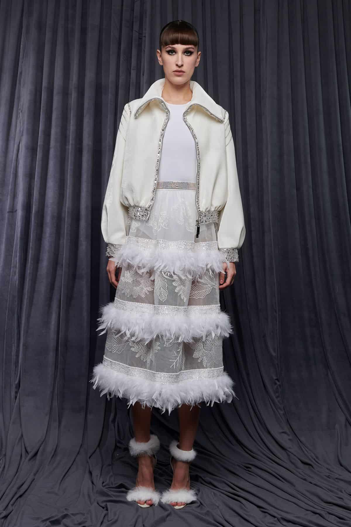 هذا وقد استخدم الريش النافر في بعض الموديلات لإطلالة ملوكية فاخرة مع أحزمة براقة على خصور العارضات.