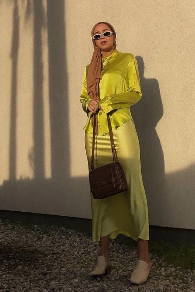 تتجنب الكثير من المحجبات ارتداء التنورة الستان لأنها تخاف أن تظهر بطرق غير محتشمة، لكن سنقدم لك طرق مختلفة، حيث اختارتها مدونة الموضة مريم محمد تنسيق التنورة الستان باللون الأصفر مع جاكيت طويل باللون الأخضر. كما ظهرت مدونة الموضة لينا أسعد كذلك بالتنورة الستان باللون النود منسقة مع بلوزة خريفية طويلة تغطي منطقة الأرداف لإطلالة عصرية محتشمة.