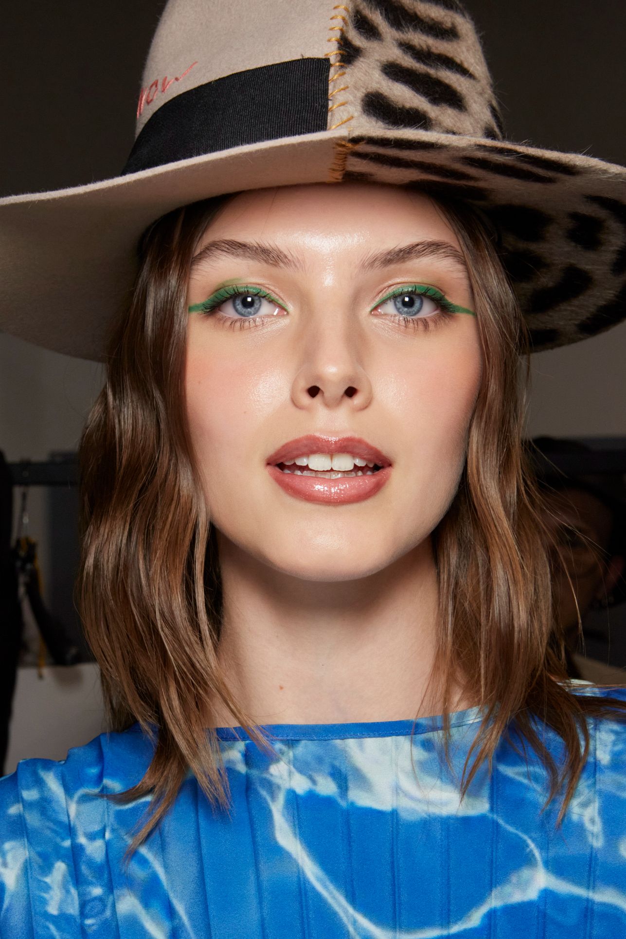 طبقي لمسة من الظلال البيج المتوسطة على الجفن العلوي المتحرك ثم قومي برسم آيلاينر باللون الأخضر الفاتح على طول خط الرموش العلوية واسحبيه لخارج العين.