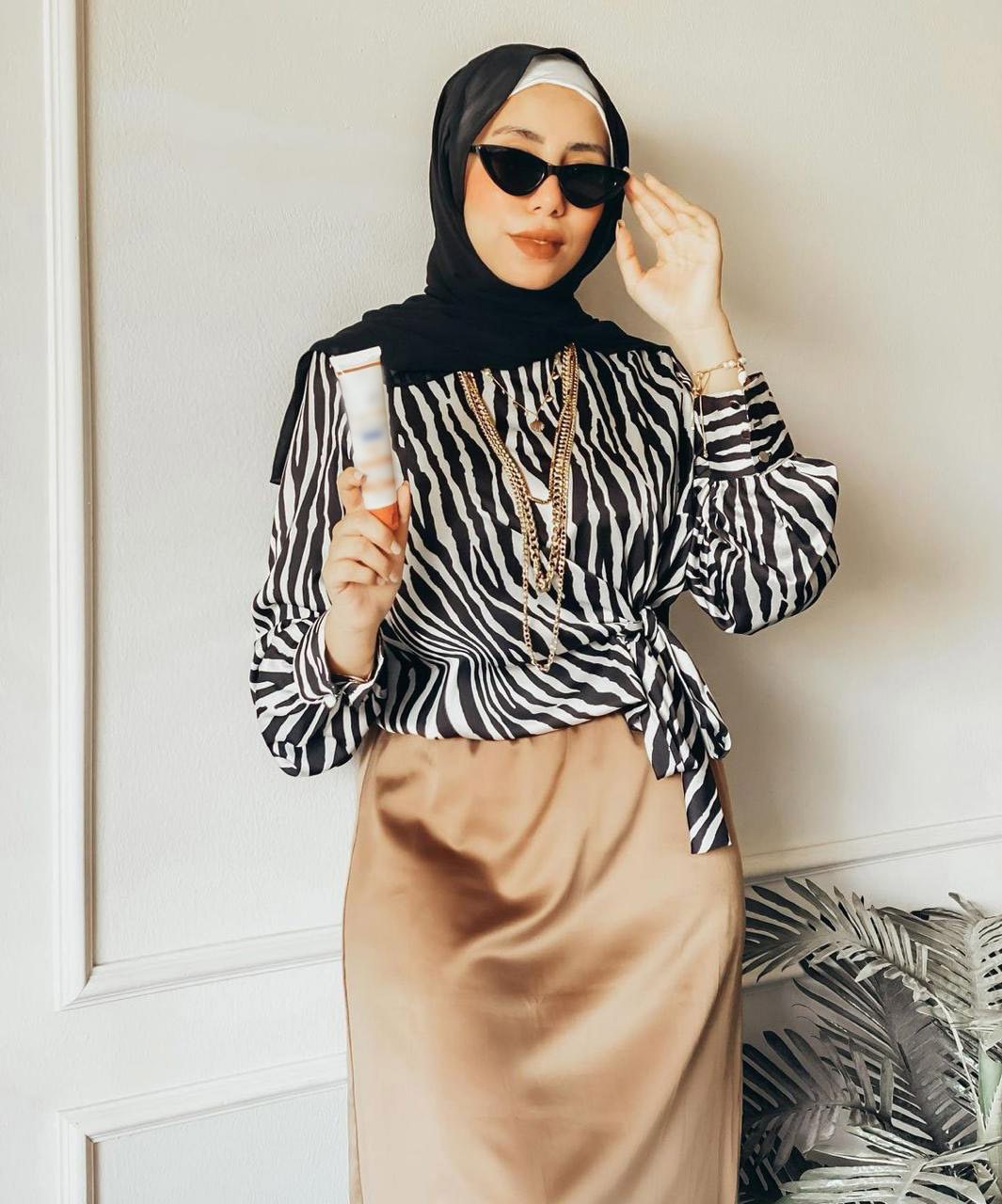 لا شك أن خامة الساتان ستحل المشكلة، قومي باعتماد تنورة بخامة الساتان بلون موحد واعتمدي معها توب بنقشة متميزة مثل الحمار الوحشي لتضفي لمسة من الأناقة على إطلالتك لكن لا تعتمديه بنفس الخامة.