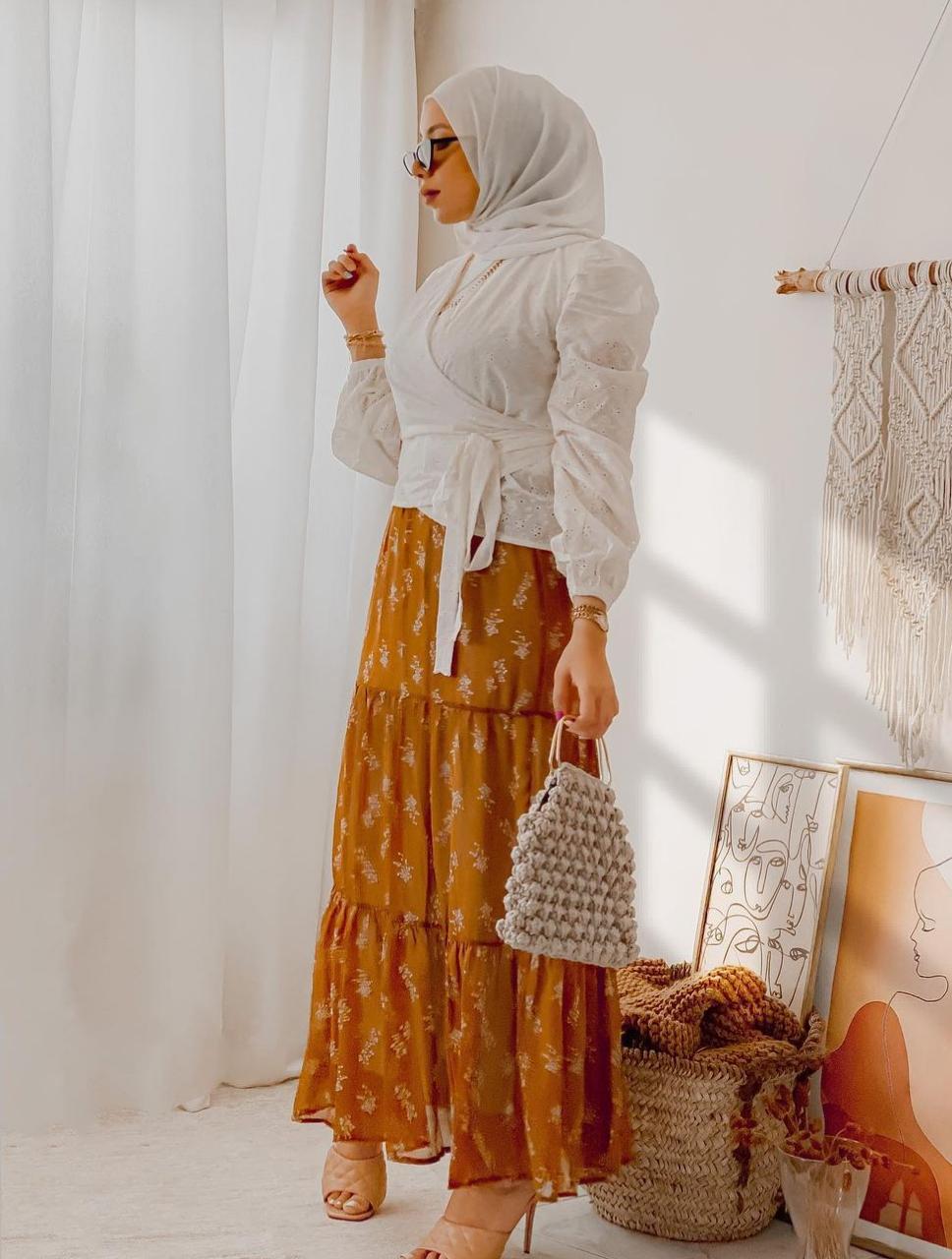 تنورة بطبعة الورود الصغيرة: طبعة الورود طبعة أنثوية بامتياز لذلك لا تترددي في اعتماد تنورة بقصة ضيقة بأي لون تفضلين يكون بطبعة الورود البيضاء ونسقيها مع قميص باللون الأبيض بقصة ضيقة عند الخصر لتكتمل إطلالتك الناعمة والجذابة.