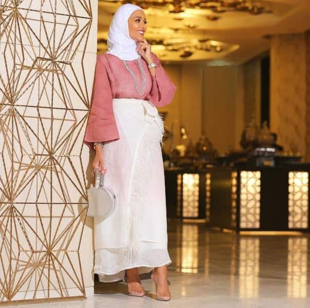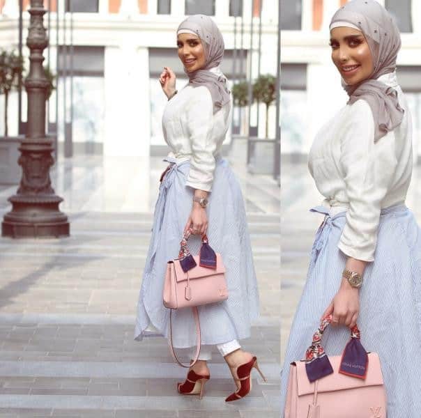 - تنورة مطبعة بخطوط عمودية: يمكنك تنسيقها مع بلوزة بيضاء وحقيبة كتف باللون الوردي من الحجم المتوسط لإطلالة نهارية مميزة.