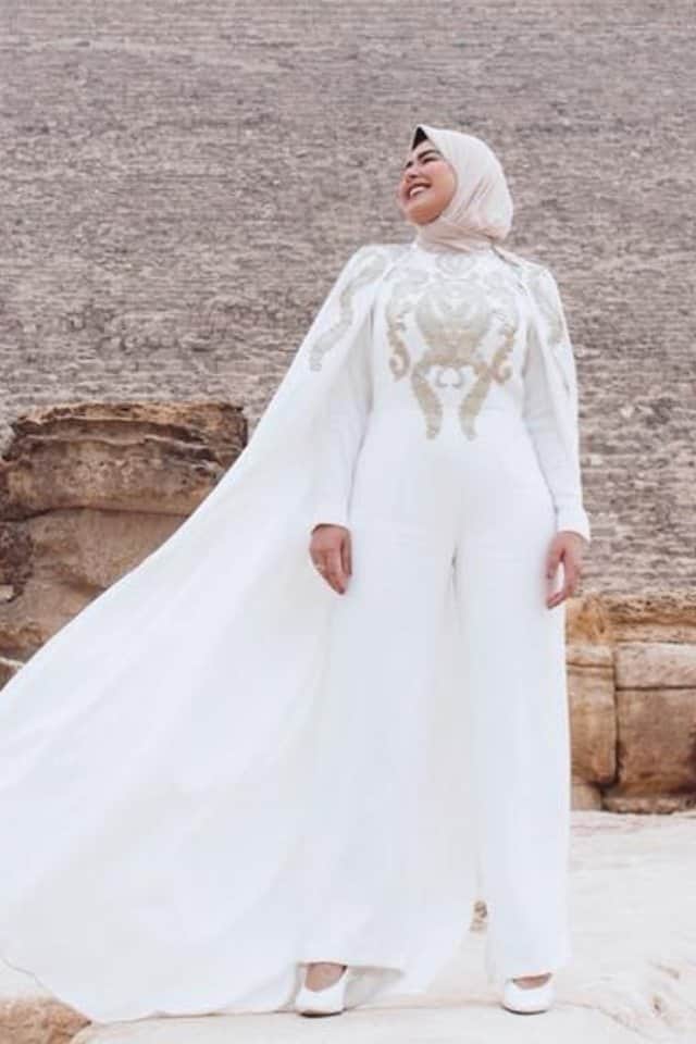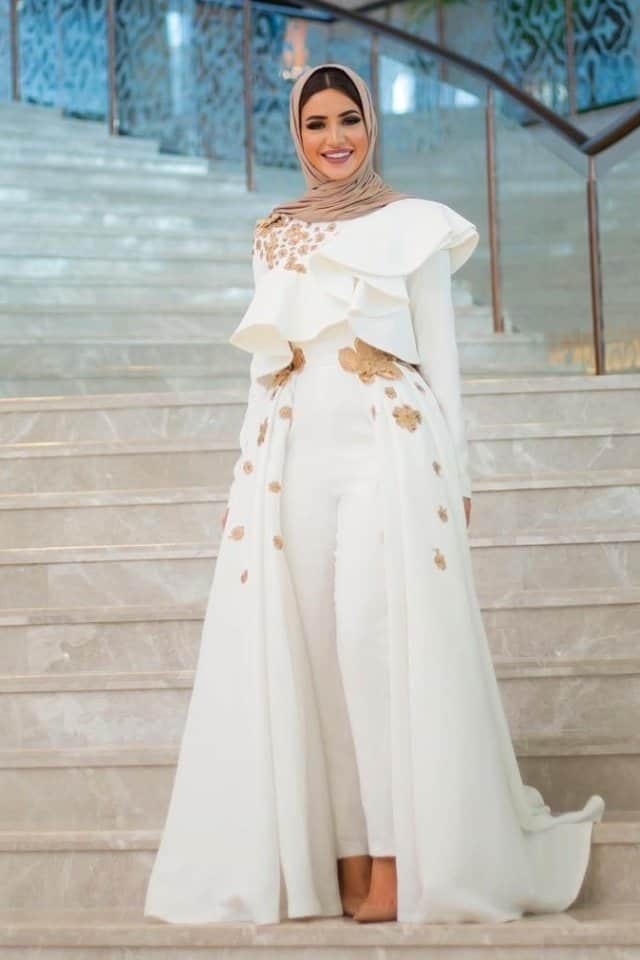 إذا كنت تريدين إطلالة محتشمة يمكنك اختيار تصميم يخفي الجزء السفلي من القوام بقصة الـ overskirt و بقصة الكاب.