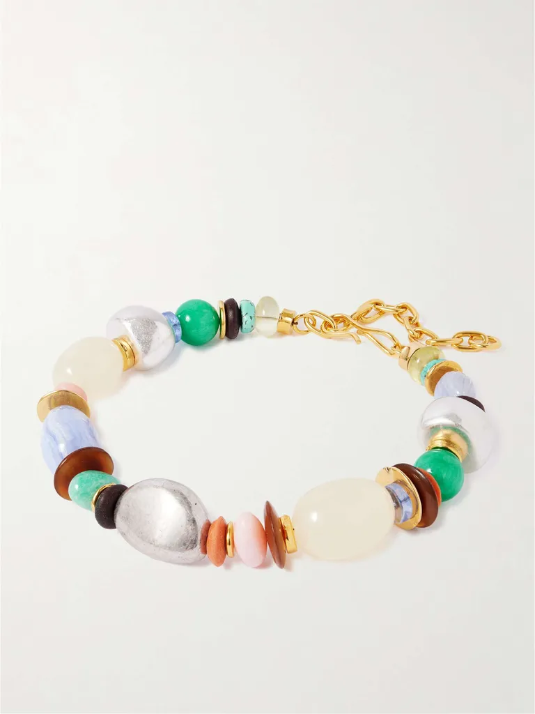 المجوهرات المزينة بالأحجار الملونة أو الخرز تستمر كصيحة رابحة، خاصة عند تنسيقها بأسلوب التكديس لإطلالة عفوية مدروسة.