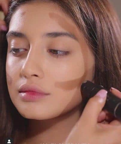 - لإبراز ملامح الوجه استخدمي الكونتور الكريمي الغامق وطبقيه في شكل رقم 3 ابتداء منبت الشعر ثم تحت الخدود وأخيرا بموازاة خط الفكين. لدمج الكونتورينغ استخدمي إسفنجة البيوتي بلندر على أن تقومي بذلك في شكل تربيت حتى لا تنقلي المستحضر لمكان آخر.