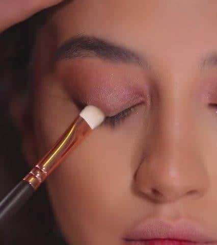 - حان وقت ظلال العيون، تحتاجين لظلال ناعمة بنغمات الوردي المشرقة. طبقي ظلال باللون الوردي الدافئ على كامل الجفن المتحرك، فيما تضعين اللون الوردي اللامع على كسرة العين.