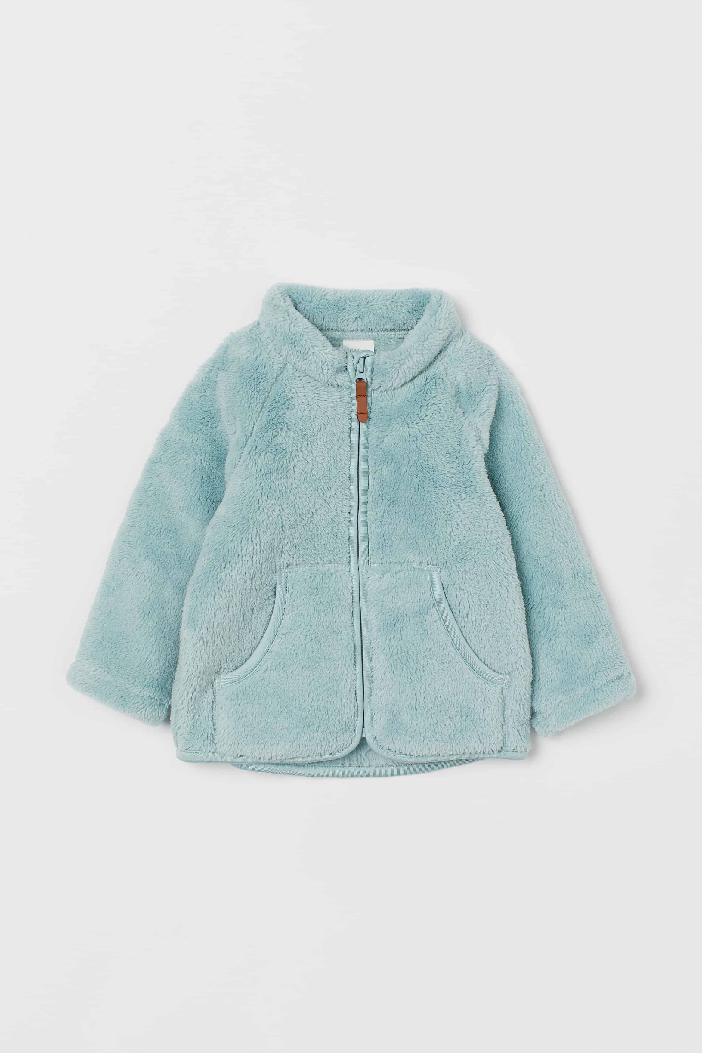 جاكيت من الفرو الصناعي الناعم، مع حواف من نسيج الجيرسيه حول الفتحة والجيوب.