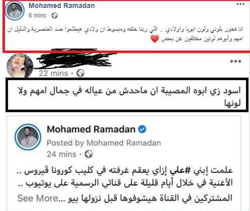 لكن يبدو أن أحد التعليقات لم تكن في محلها، حيث تعرض الطفل للتنمر بسبب لون بشرته “أسود زي أبوه المصيبة محدش من عياله في جمال أمهم ولا لونها”، ليرد عليها محمد رمضان “أنا فخور بلوني ولون أبويا وأولادي اللي ربنا خلقه ومبسوط أن ولادي هيطلعوا ضد العنصرية والدليل إن أمهم وأبوهم لونين مختلفين عن بعض”.