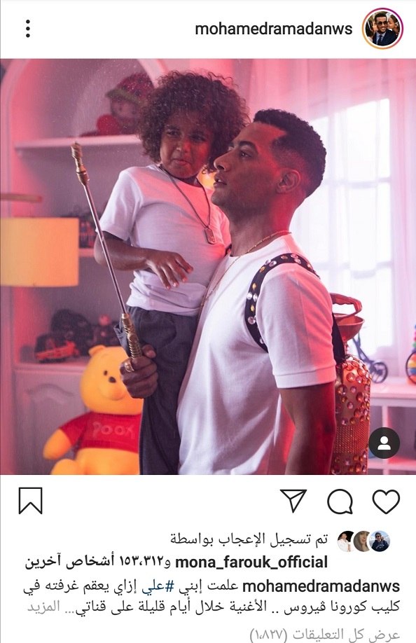 نشر المطرب الشعبي محمد رمضان صورة له رفقة نجله على محمد رمضان على حسابه الخاص على الانستغرام وقد علق عليها “علمت إبني #علي إزاي يعقم غرفته في كليب كورونا ڤيروس .. الأغنية في خلال أيام قليلة على قناتي الرسمية على يوتيوب .. المشتركين في القناة هيشوفوها قبل نزولها بيوم ثقة_في_الله_نجاح “.