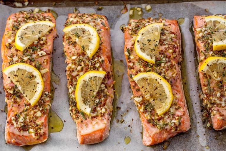 - أضيفي الزعتر والليمون فوق شرائح سمك السلمون المشوي وقدمي الطبق.