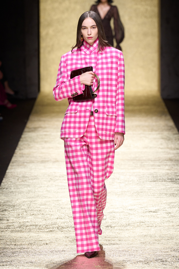 النقشة الكلاسيكية تعود هذا الموسم بألوان زاهية ومشرقة كما في بدلة لويزا سبانيولي التي جاءت بمربعات وردية وبيضاء لإطلالة جريئة ومرحة.