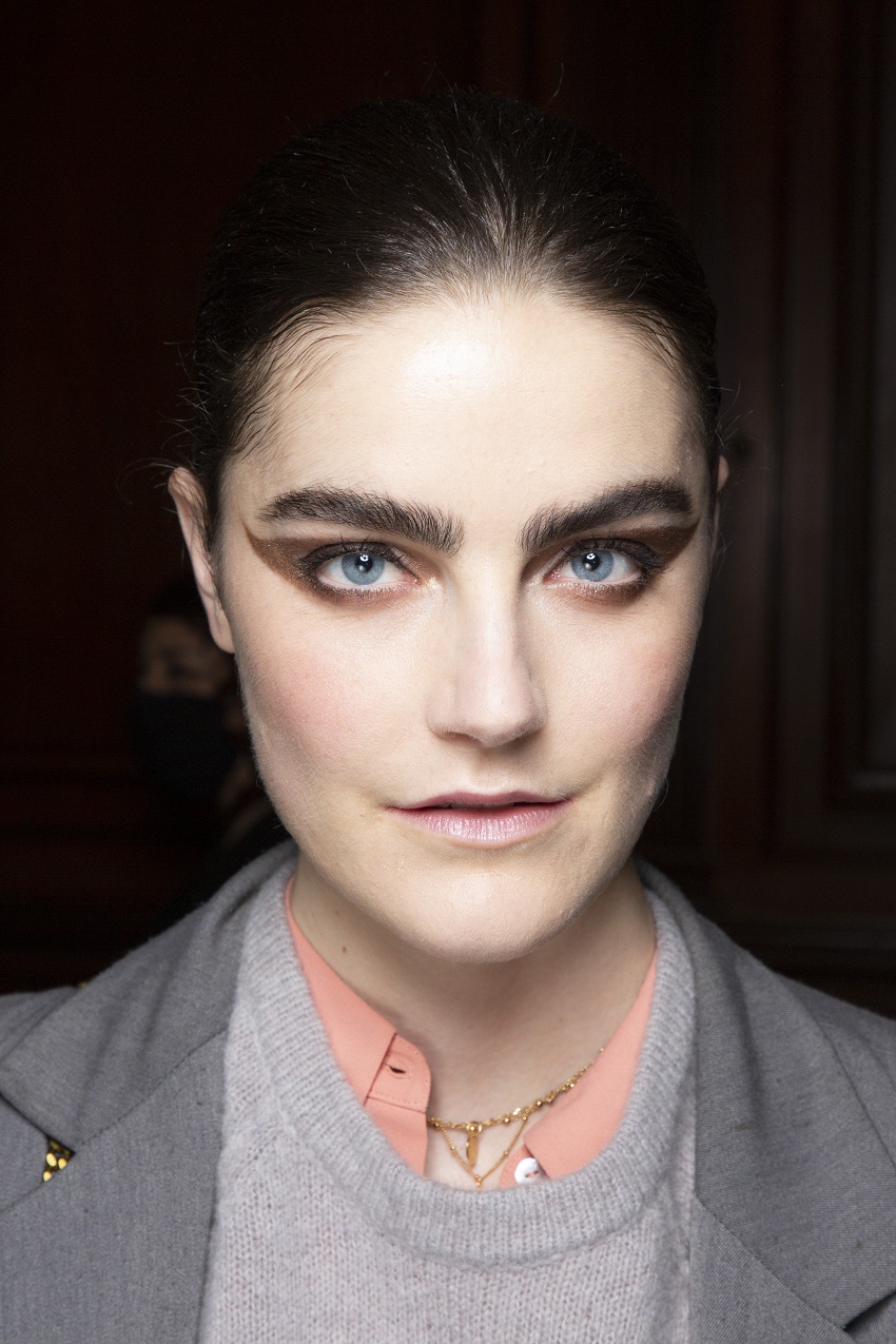 تخلصي من الروتين من خلال التخلي عن الآيلاينر الكلاسيكي مقابل الآيلاينر الغرافيكي على كامل الجفن العلوي. استخدمي اللون البرونزي الجذاب عوضا عن اللون الأسود، ارسمي الآيلاينر من بداية الزاوية الداخلية وصولا لنهاية العين ثم اسحبيه لخارج العين ليصبح موازي لنهاية الحاجب لكن بشكل مجنح.