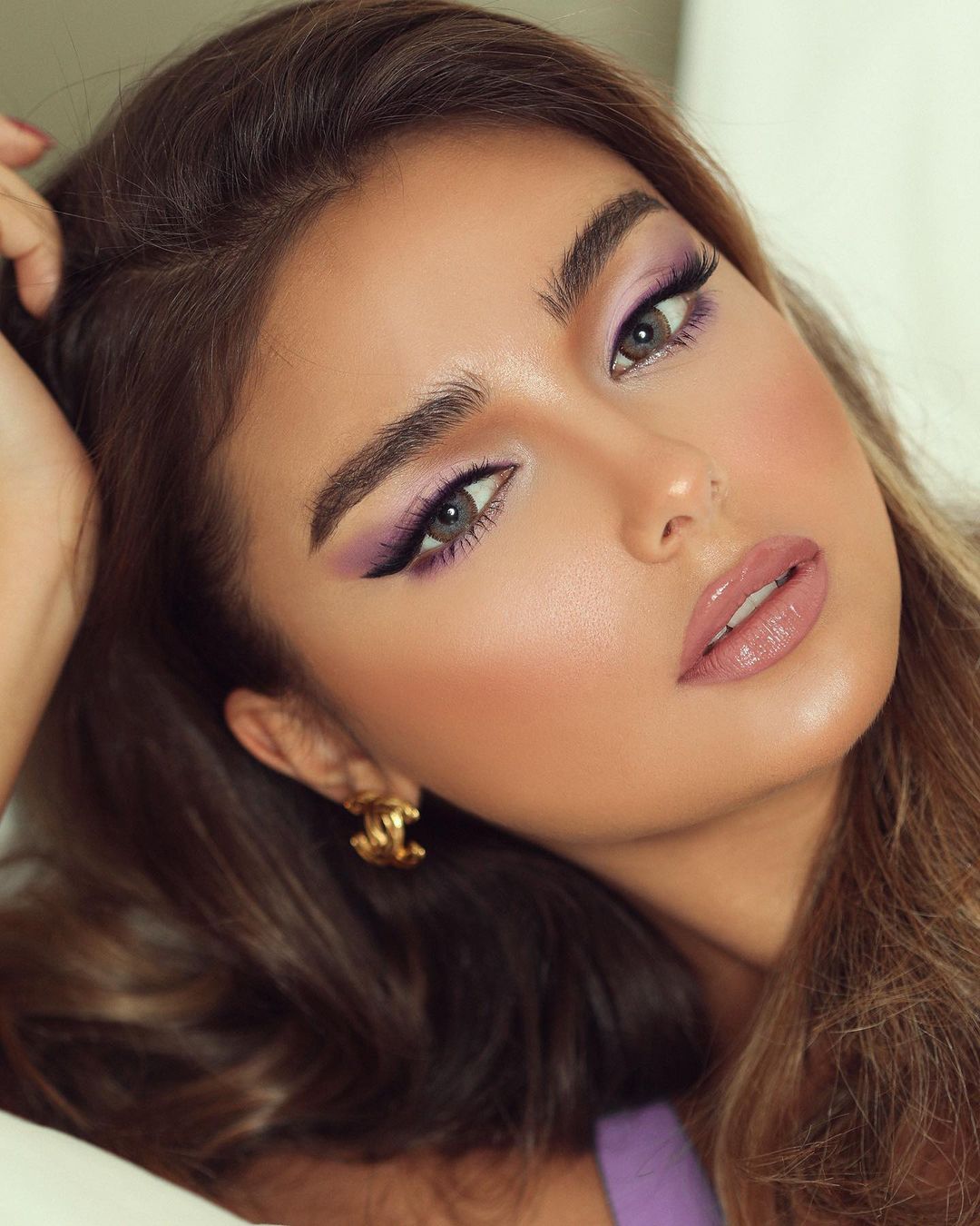 يعد اللون البنفسجي من أجمل الألوان التي تضيف الحيوية على العيون، استخدمي درجة فاتحة للغاية على كامل الجفن العلوي وعند مدمع العين.