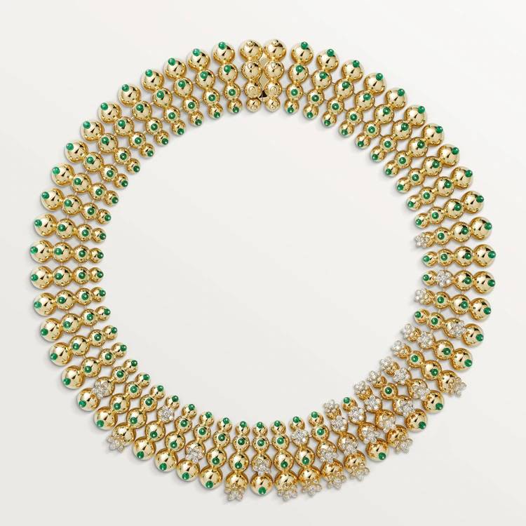 العقد مرصع بالماس الأبيض في شكل أزهار وبأحجار الزمرد الخضراء لتزيد العقد جاذبية وأناقة.
