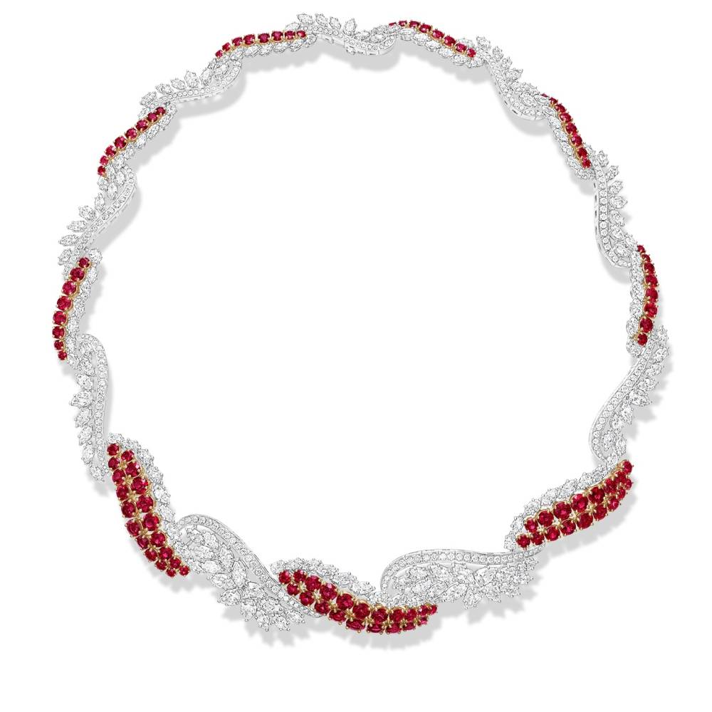 تصميم أنثوي جذاب، عقد من الذهب الأبيض في شكل قطع متشابكة مرصع بالماس الأبيض والياقوت الأحمر ليجعل منه قطعة ملفتو للانتباه لمحبات المجوهرات.