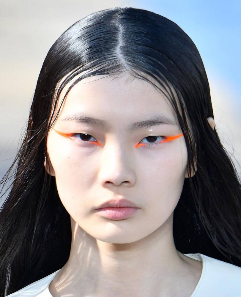 دار Chloé للأزياء تنقل مكياج العيون لمستوى غير مسبوق من خلال رسمة الآيلاينر باللون البرتقالي النيون والتي تبدأ عند الزاوية الداخلية والخارجية فيما تم استخدام الظلال اللامعة عند منتصف الجفن العلوي.