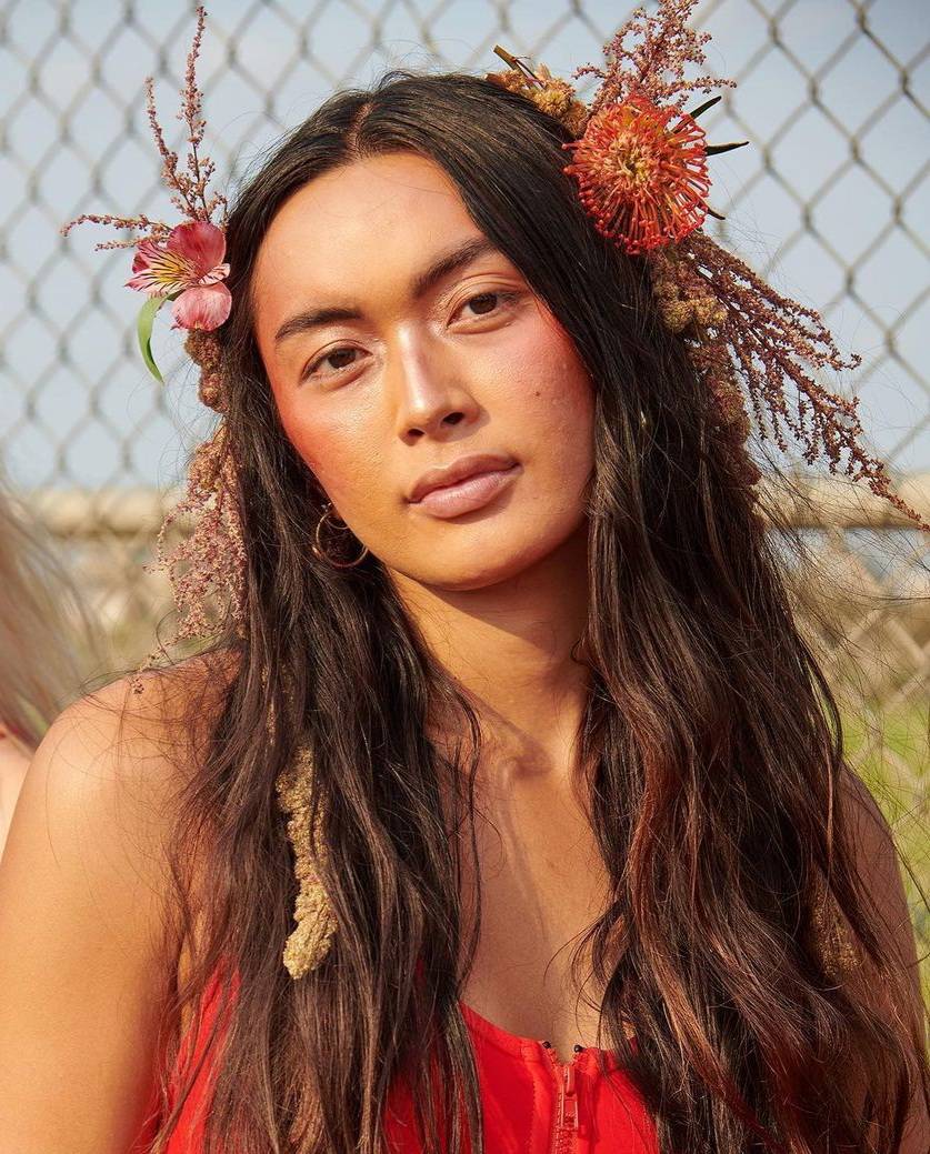 تسريحة شعر ناعمة مموجة من وحي دار Chromat مع إضافة الورود على الجانبين لإطلالة أنثوية ملفتة.