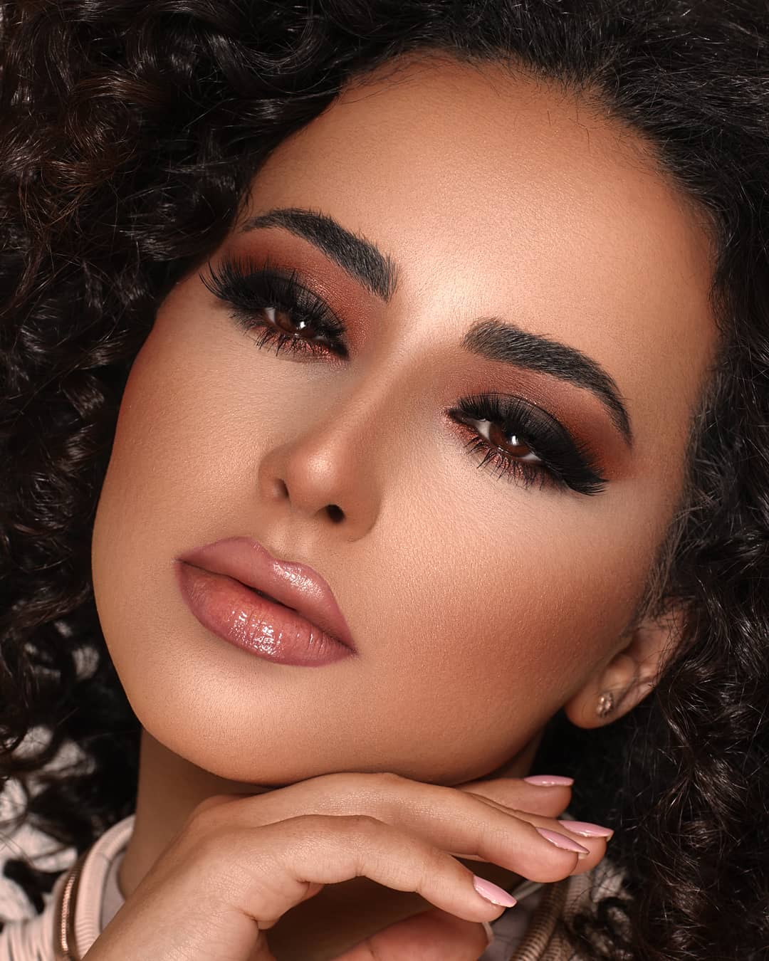 لا بأس بتطبيق مكياج عيون سموكي ملون، جربي الظلال البنية اللامعة بدرجة الشوكولا، وزعيها بأسلوب دخاني على كامل الجفون العلوية. حددي العين برسمة آيلاينر مجنح مع وضع أحمر شفاه نيود لامع وحمر زهرية خفيفة.