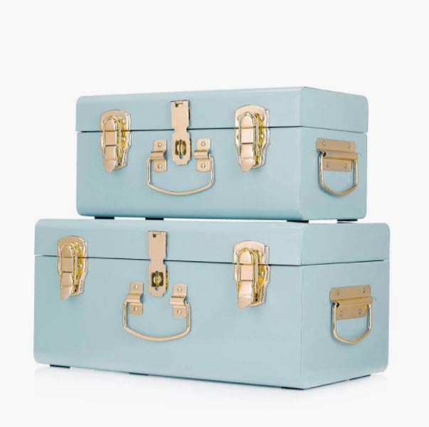 حقائب في شكل صناديق مع إكسسوارات ذهبية تأتي بحجم كبير ومتوسط من علامة QVC.