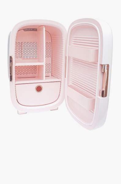 حقيبة مكياج مستوحاة من شكل البراد مع فواصل تساعد في تنظيم المستحضرات الصغيرة بشكل أفضل. الحقيبة من علامة Revolve.