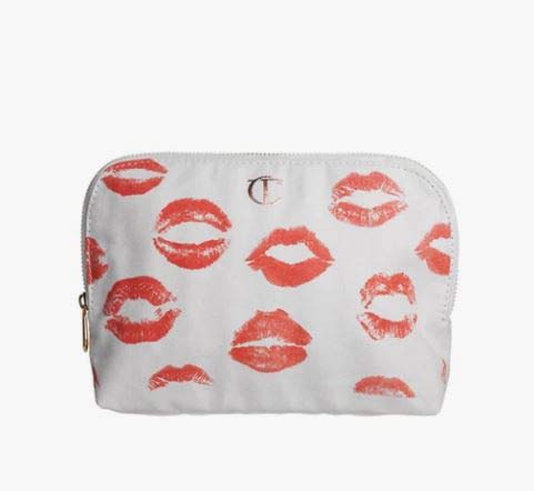 حقيبة مكياج كلاسيكية من القماش الأبيض مزين بطبعة الشفاه الملونة وهي مزودة بسحاب ليسهل عملية فتحها من علامة Charlotte Tilbury.