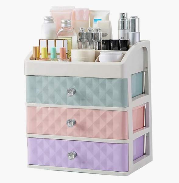 صندوق تنظيم مكياج يتضمن 3 طوابق صغيرة بألوان مختلفة من علامة Wayfair.